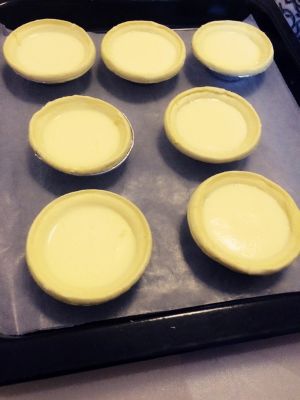 预热烤箱 大概180度的样子 十分钟后 将蛋挞放入烤箱 烤制大概半小时 不过最好还是自己看看 因为个人情况不太一样