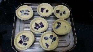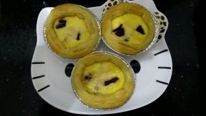 然后蛋挞皮放烤盘摆好,先放好蒸好紫薯丁,然后加上八分满的酱。放进烤箱……烤箱先预热5分钟,上下火210°,烤18分钟就好。