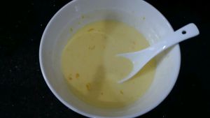 把两个蛋黄,7勺淡奶油,7勺纯牛奶,1.5勺炼奶放比较打点碗里,用汤勺搅拌均匀就好
