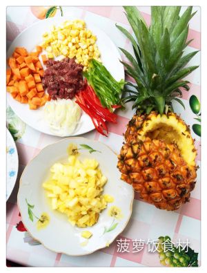 热锅,加油。先放牛肉翻炒均匀后倒入玉米粒后加萝卜丁加菠萝肉丁后加米饭翻炒,熟后加少许红、青椒丝,出锅前加入葱丝,装入菠萝里装饰,OK
