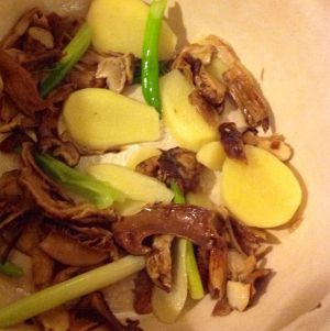 姜切片,大葱切段。锅内放1茶匙植物油,烧热,放姜片和葱段爆一下,加入洗净控干水的松茸炒香。