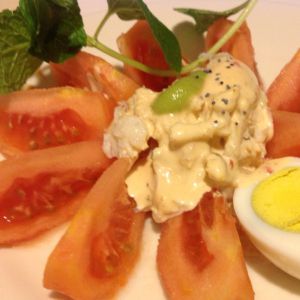 等待中,翻出冰箱里的食材,随手弄了一个蟹肉沙拉。又烫了一些青菜。