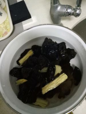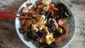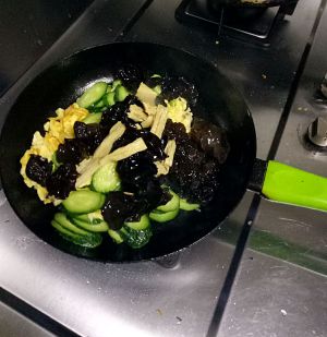 加入黑木耳,翻炒均匀,稍微加一点水,也就两勺吧!