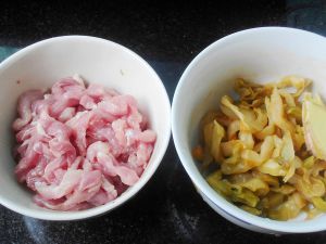 瘦肉切丝,加少许盐和油拌一拌;榨菜洗一下-如果想味道重一些就不用洗了