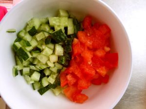 把切好的黄瓜丁,番茄丁和鸡蛋,米饭同炒。(和平时做炒米饭一样。放盐量也一样。)