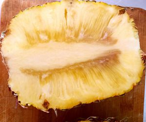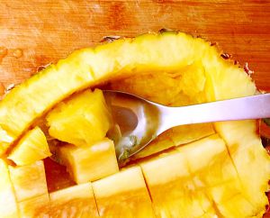 用勺子沿划痕把菠萝挖出,做成菠萝碗。