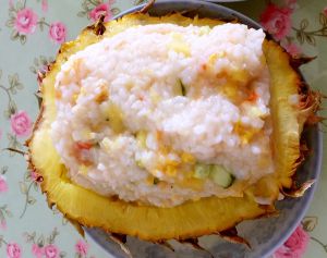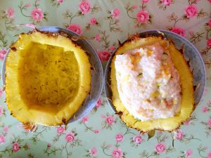把炒好的米饭放入菠萝碗中,两半合上,蒸5分钟。