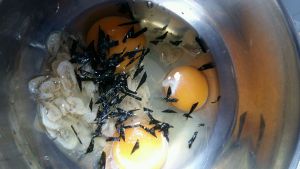 把鸡蛋,海苔,虾米,放入一起搅拌,搅拌的时候加少许水,加少许盐。