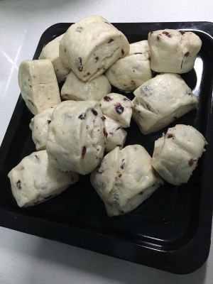由于是第一次做,所以前面没拍照,下次补上,牛奶加热至温热,把酵母倒入温牛奶中搅拌均匀,静至15分钟,蔓越梅放温水中泡软