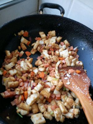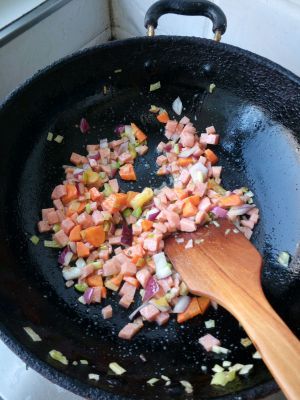 热油,葱煸香,加入胡萝卜,洋葱,火腿肠,放盐,耗油,