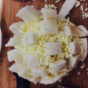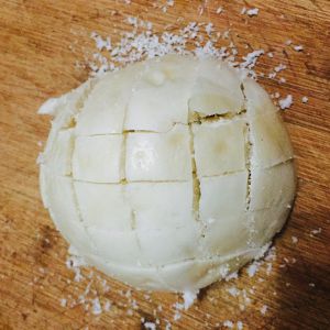 在砧板上撒上干面粉 面粉分成几段 用到切大小差不多的团子