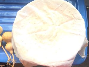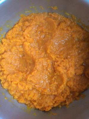 将南瓜切片上锅蒸熟,用勺子碾成泥。待南瓜泥放凉至30度左右(不烫手)时,放入酵母粉。