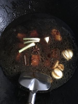 加入蒜 葱白 生姜 八角 桂皮 小半碗料酒
