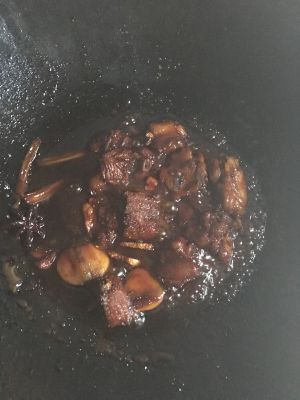 加入适量的老抽生抽至表面颜色如图片色。再加入三大勺白糖加入之前的排骨汤淹没排骨即可。