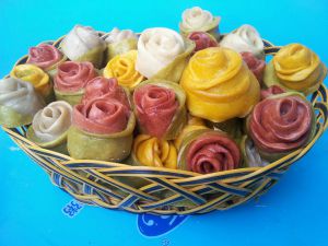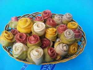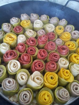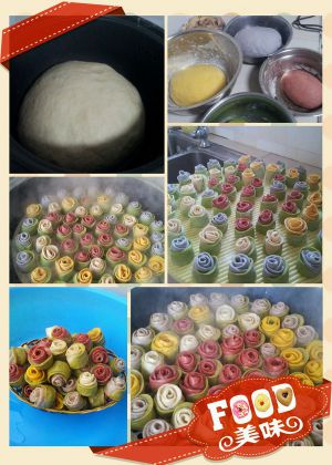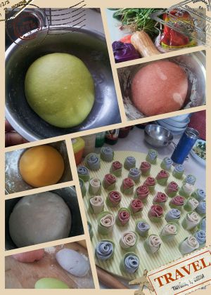 第三步!等面团们都发酵到一倍大时就可以做造型了!各种颜色分别分成相等的剂子擀成皮!然后五个片一组就可以随自己拼颜色卷花啦!