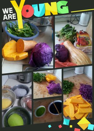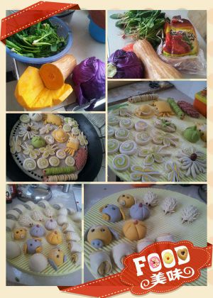 第一步,首先把各种颜色比如南瓜洗好去皮切片蒸熟!紫甘蓝洗净切碎加水炸汁,菠菜洗净切碎炸汁!