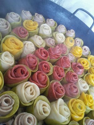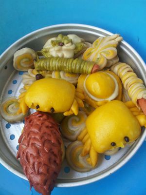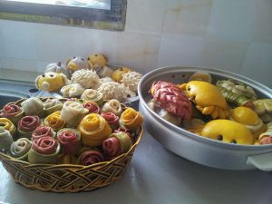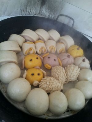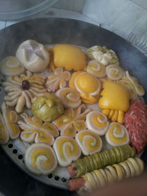 接着我做了螃蟹,南瓜,猪头,猪蹄,刺猬,刀切花卷,蝴蝶,棒棒糖,苹果,菊花,荷花,虫子,火龙果,草帽和花开馒头还有普通圆馒头!