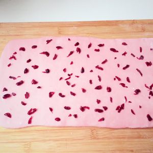 取适量用来整形的面粉,撒在案板上防沾,揉面团排气,反复用擀面杖擀,撒面粉,重叠。直到完全排气好,擀成长方形。均匀铺上切碎的蔓越莓干。