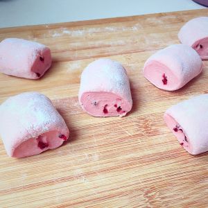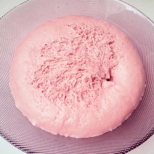 然后再用面粉柔一个紫面团,紫薯压成泥放面里揉匀,酵母和白糖和上步骤一样,用温水化开,揉成紫色面团,盖膜醒发