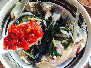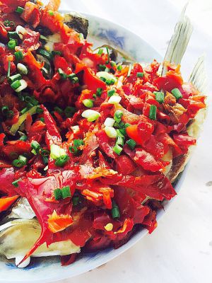 将双椒和酱汁铺在鱼头上,入锅再蒸10分钟
