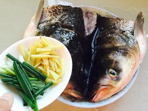 蒸熟的鱼头放入干净的容器中,在底下垫上姜片和葱段