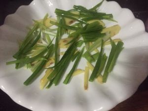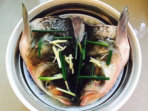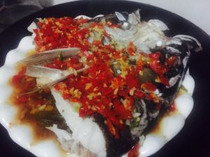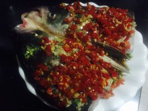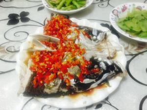 把鱼放在盘里,姜片垫底,锅里加油加,泡椒小米椒蒜葱头鸡精 ,炒香以后倒在鱼头上面,水烧开以后真七分钟,开锅撒上葱花ok了,