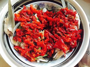 剁椒均匀铺在鱼上面,下锅蒸二十分钟左右。