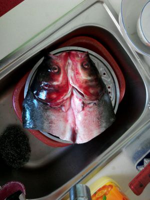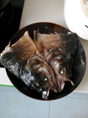 鱼头洗净晾干,正反面均匀涂抹上食盐、胡椒粉、料酒少许(如果和我一样特别怕腥的,另可贴上姜片同腌),腌制15分钟左右入味。