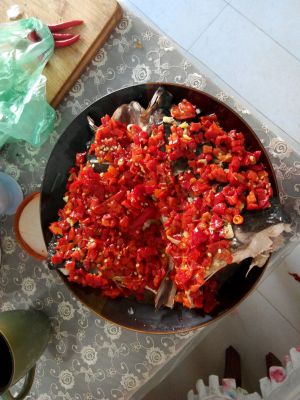 将准备好的剁椒撒在鱼头上,全覆盖,放入锅中,蒸15分钟,出锅即可。