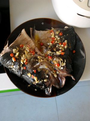 蒸鱼完成后,将蒸鱼盘中的水倒掉(因为怕腥,所以倒掉,如果爱吃鱼的人是可以不倒的,或者入锅前套个保鲜膜防水蒸气),在鱼头上均匀淋上蒸鱼鼓油即可!(如果想吃多油重口味版,可再淋上一些热油)
