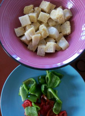 馒头切成丁,均匀裹上蛋液,青红椒洗净切小块。