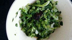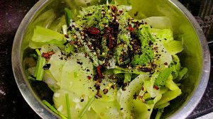 将腌出的水分倒出,可以尝一下莴笋丝的咸淡,淡的话再加点盐,然后分别加入鸡精,糖,麻油,蒜沫拌匀即可
