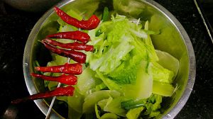 莴笋竿跟莴笋尖分别切片,小葱切段,大蒜拍切丁,搅拌均匀备用,干辣椒用签好,在火上烤焦即可,