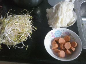 所有的食材准备好,挂面或者新鲜面条都可以,蔬菜的话根据自己喜欢的口味随意添加,家里冰箱只有这几种就一样来点放了。
