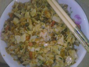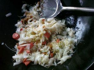 姜葱炝锅后,将卷心菜,胡萝卜等辅料切丝倒入,加入少许的水,不用太多