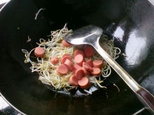 面条在凉水里捞出来放进锅里,再放上一勺蚝油提味,翻炒一下,记得火候要大。