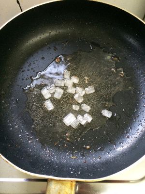 之前五花肉炸出的油,足够了,加几颗冰糖准备炒糖色,冰糖能让五花肉更亮一些。