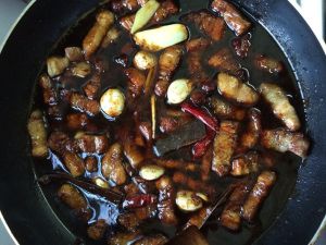 放入之前炸好的五花肉。翻遍几遍,差不多都变色,接下来.