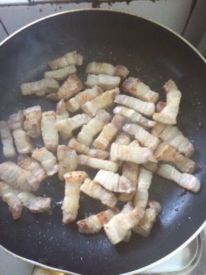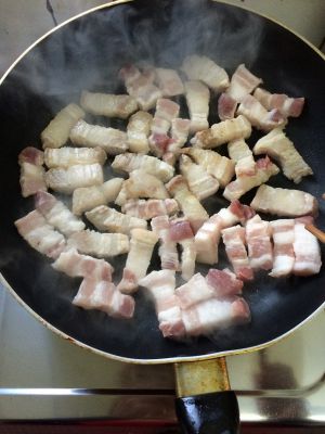 直接把五花肉切成如图状,大小可以随你喜欢,直接放在锅里,干煎,因为五花肉肥肉多,所以不用放油。最好用不粘锅。