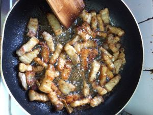 倒入五花肉和姜片翻炒,五花肉不用焯水