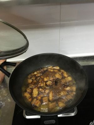 等到酱油色挂到五花肉上,加入开水默过五花肉即可(注意一定是开水),加入一勺料酒,适量冰糖,大料三个,中小火咕嘟入味。