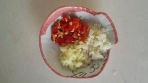 碗里放蒜碎、葱头碎、盐,锅里烧热油有轻微冒烟就行,然后倒到碗里,再加入调料(酱油,醋,糖,辣椒酱)均匀搅拌~