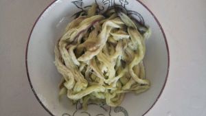 将取出的茄子晾凉后,把外皮撕掉,把剩下的茄子撕成一条一条的