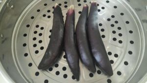 将茄子冲洗后,上锅蒸软,茄子大小不一所以每个人蒸的时间不太一样,可以用筷子扎茄子,如果可以轻易的扎透,即熟了,取出