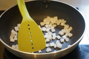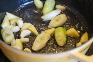 用煎过五花肉的余油,将葱姜蒜八角煸香