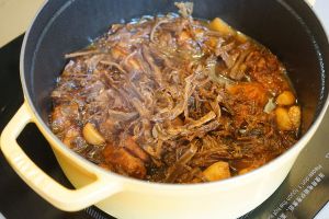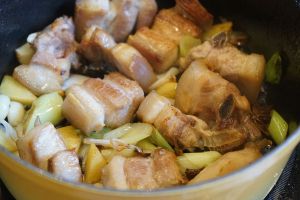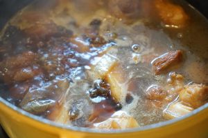 中小火炖至40分钟~1小时,直至五花肉完全酥烂为止
