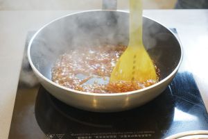 炒糖:中火将冰糖慢慢炒融化,其中有结块现象时可倒入少许油,