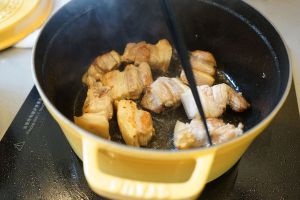 下入五花肉块进行煸炒