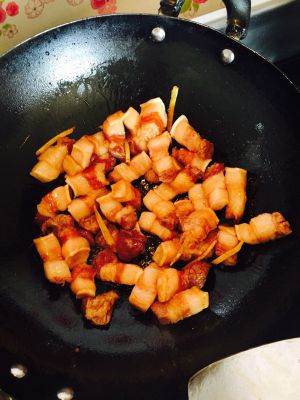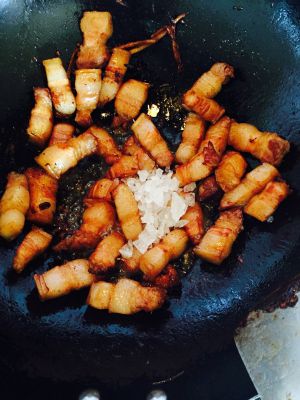加入腌制好的五花肉,和三个八角,几颗花椒翻炒,均匀上色