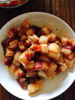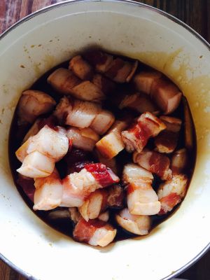 五花肉切块,太大不好,太小也不好,自己掌握 加入适量酱油,料酒,白糖少许,不用放盐 姜少许腌制半小时以上